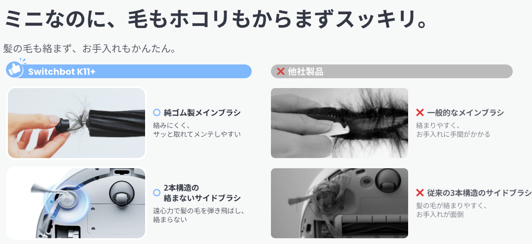 K10+から進化したK10+ proの純ゴム製メインブラシ、絡まり防止サイドブラシはそのままK11+に引き継がれて、さらにメンテナンスの手間も少なく。