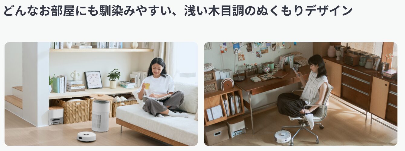 木目調ステーションと組み合わせることで、どこに置いてもインテリアの一部のように馴染みます。ロボット掃除機=無骨なガジェットというイメージを覆してくれます。