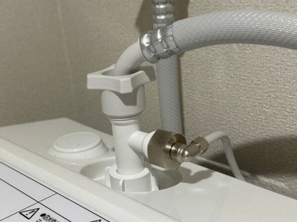 洗濯機と既存のチューブの間に分水器を取り付けて分岐させ、排水は洗濯パンの中にケーブルごと突っ込めばおしまいです。